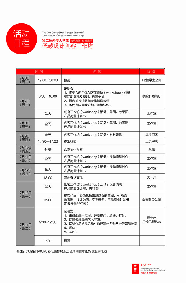 为加强两岸大学生的交流,推动低碳思想与生态设计的传播与创新,大力推进大众创业、万众创新,由我院主办的海峡有渡创意无限---第二届两岸大学生低碳设计创客工作坊(workshop)活动将于7月6日至14日举行。