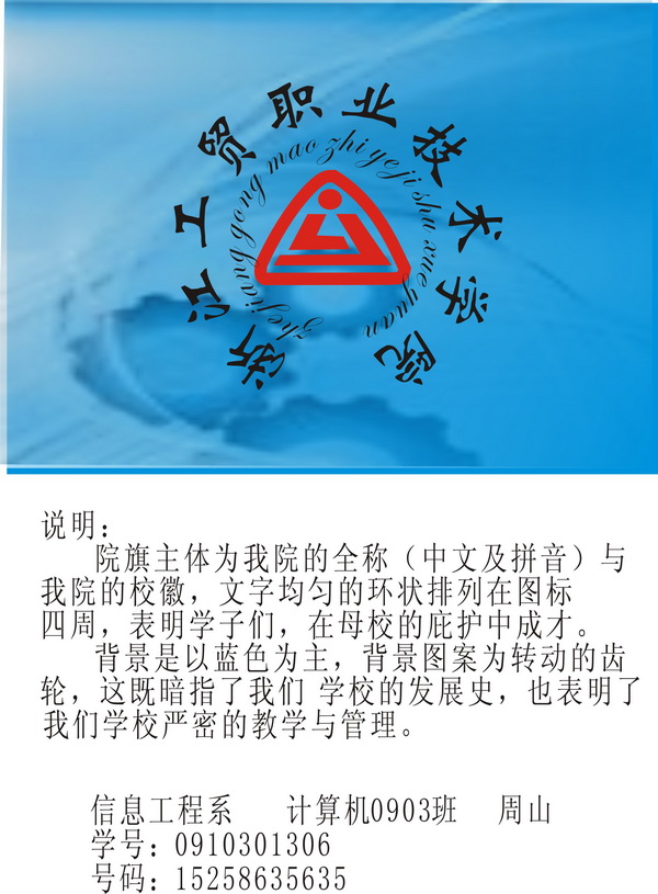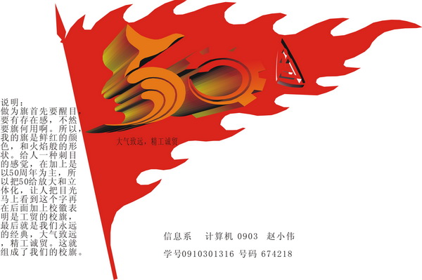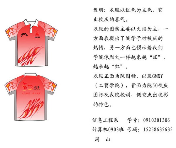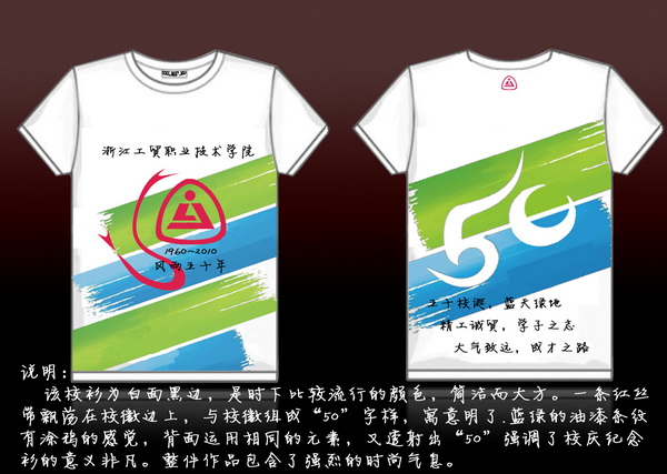 我院50周年校庆学生教育活动之“校衫、校旗、校庆纪念品”设计大赛已于日前圆满结束。本次大赛开展以来,得到了同学们的热烈响应,共征集稿件160余件。学生处本着认真、严谨的原则,邀请了有关专家组成评审组,对所有参作品进行了评审。经过评委老师们公平、公正的审议,以下作品以其鲜明的时代特征和独特的设计理念,充分体现了我院的精神和传统,展现我院的文化底蕴与艺术品位,最终入围本次大赛: