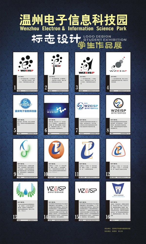 1、温州电子信息科技园标志设计大赛作品于5月8日至5月12日在6号教学楼一楼大厅展出,欢迎各位老师和同学前往观摩或见学院网站公告()。