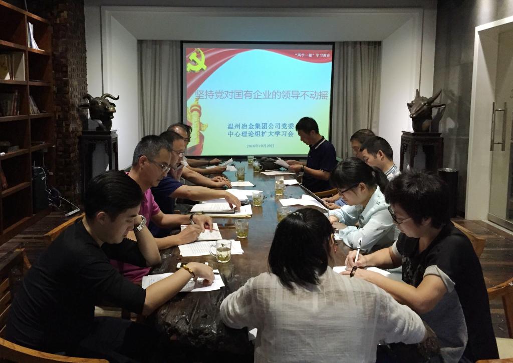 10月20日温州冶金集团公司党委副书记主持召开理论中心组扩大学习会,认真传达学习习近平总书记在全国国有企业党的建设工作会议上的重要讲话,公司党委班子成员以及行政党支部、科教后勤服务党支部全体党员参加学习会。