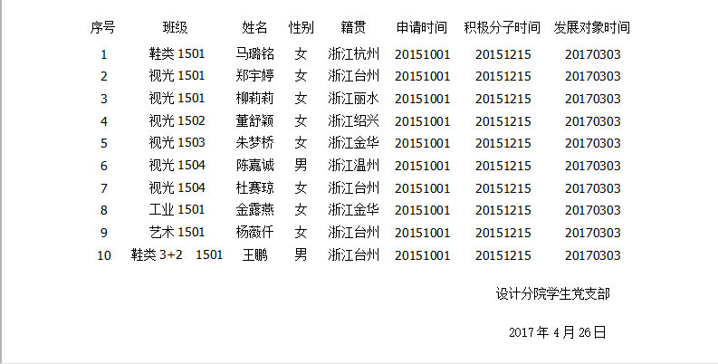 根据本人申请、组织培养,经设计分院学生党支部研究,设计分院党总支同意,拟吸收马璐铭等10名同志为中共预备党员,现将有关情况予以公示。在公示期限内,欢迎广大党内、外群众通过信函、电话或直接反映等方式予以监督,以个人名义信函反映问题提倡署真实姓名。