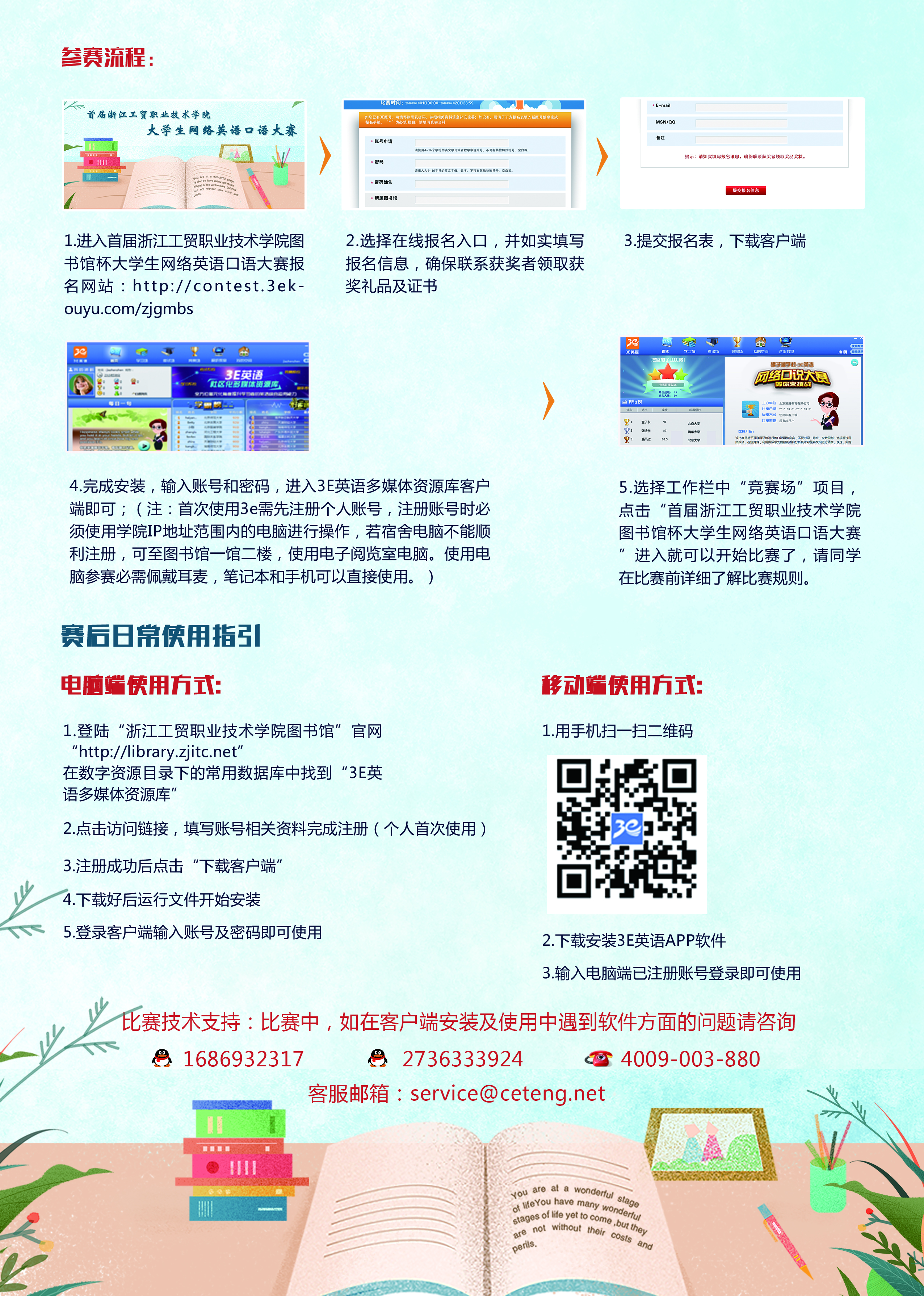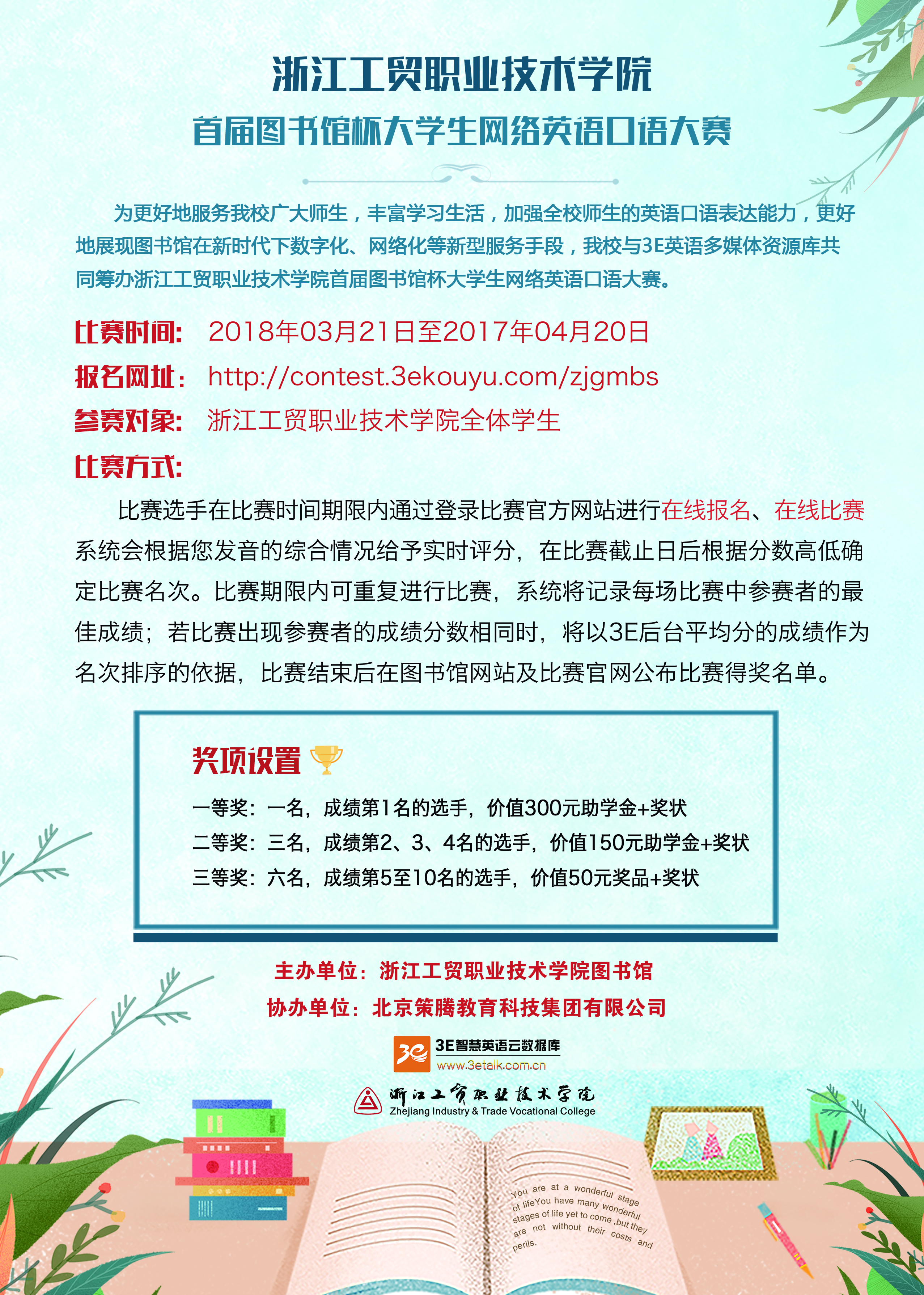 在2018年世界读书日即将来临之际,学院图书馆为更好地服务我院广大师生,丰富日常学习生活,加强我校师生的英语口语表达能力,更好地展现图书馆在新时代下数字化、网络化等新型服务手段,特联合3E英语多媒体资源库共同筹办“伟德BETVlCTOR1946首届图书馆杯大学生网络英语口语大赛”。敬请广大同学积极参与!