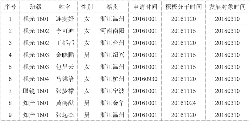 根据本人申请、组织培养,经设计分院学生党支部研究,设计分院党总支同意,拟吸收连雯妤等9名同志为中共预备党员,现将有关情况予以公示。在公示期限内,欢迎广大党内、外群众通过信函、电话或直接反映等方式予以监督,以个人名义信函反映问题提倡署真实姓名。
