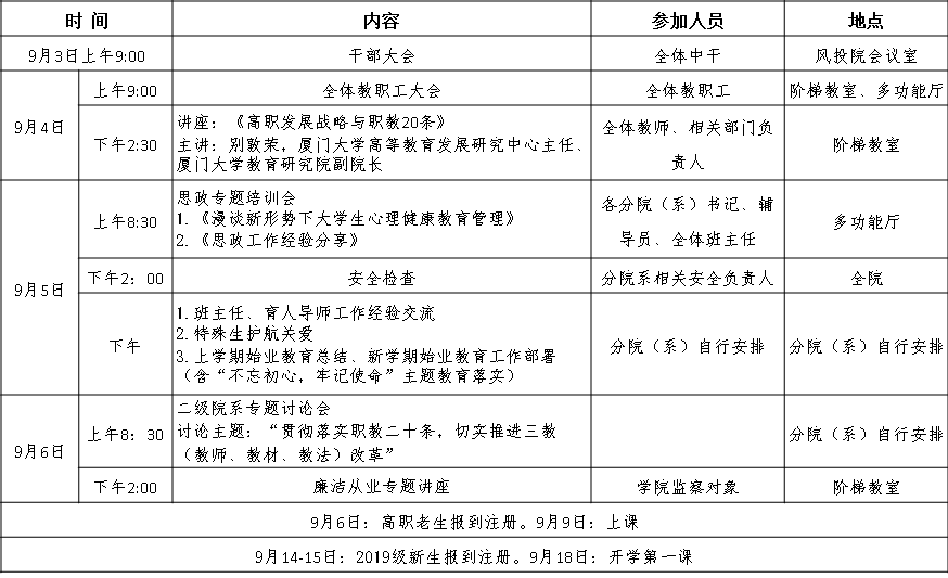 根据学院2019年总体工作要求,为确保2019年度秋季学期各项工作有序开展,现将开学初工作安排通知如下: