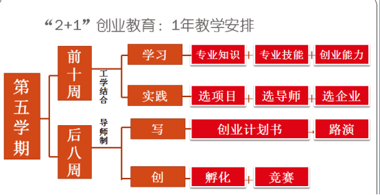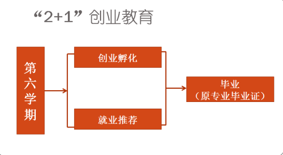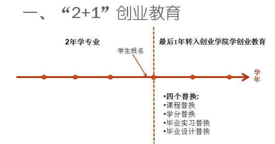 “2+1”创业教育即前两年学生在二级院系学习专业,第三学年转入创业学院免费接受创业教育。第三学年所学的课程、学分、创业实践与创业计划书,替代原专业培养方案规定的课程、学分、实践和毕业设计。“2+1”创业教育采用与行业企业开展深度合作的模式,校企共同设计第三学年的培养方案及教学课程,由行业企业专家负责授课。创业学院安排班主任,负责学生在创业学院学习期间的教学、思政等日常管理工作。