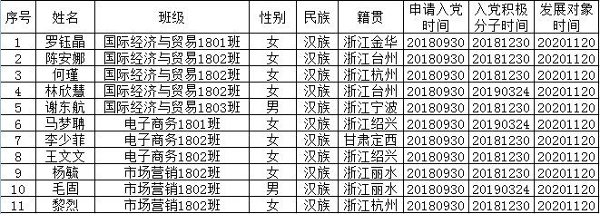 根据本人申请、组织培养,经国际商贸学院学生党支部研究,国际商贸学院党总支同意,拟吸收罗钰晶等11位同志为中共预备党员,现将有关情况予以公示。在公示期限内,欢迎广大党内、外群众通过信函、电话或直接反映等方式予以监督,以个人名义信函反映问题提倡署真实姓名。