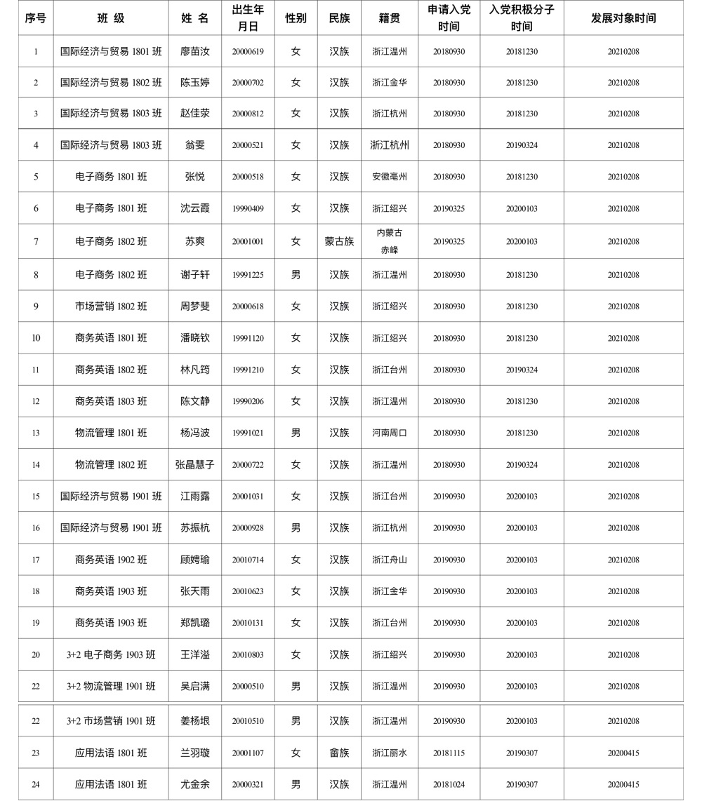 根据本人申请、组织培养,经国际商贸学院学生党支部研究,国际商贸学院党总支同意,拟吸收廖苗汝24位同志为中共预备党员,现将有关情况予以公示。在公示期限内,欢迎广大党内、外群众通过信函、电话或直接反映等方式予以监督,以个人名义信函反映问题提倡署真实姓名。