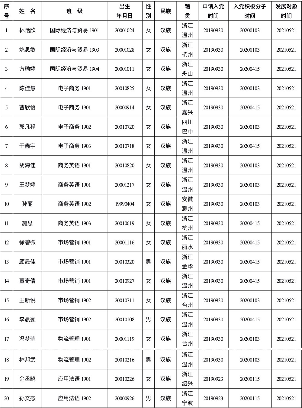 根据本人申请、组织培养,经国际商贸学院学生党支部研究,国际商贸学院党总支同意,拟吸收林恬欣等20位同志为中共预备党员,现将有关情况予以公示。在公示期限内,欢迎广大党内、外群众通过信函、电话或直接反映等方式予以监督,以个人名义信函反映问题提倡署真实姓名。
