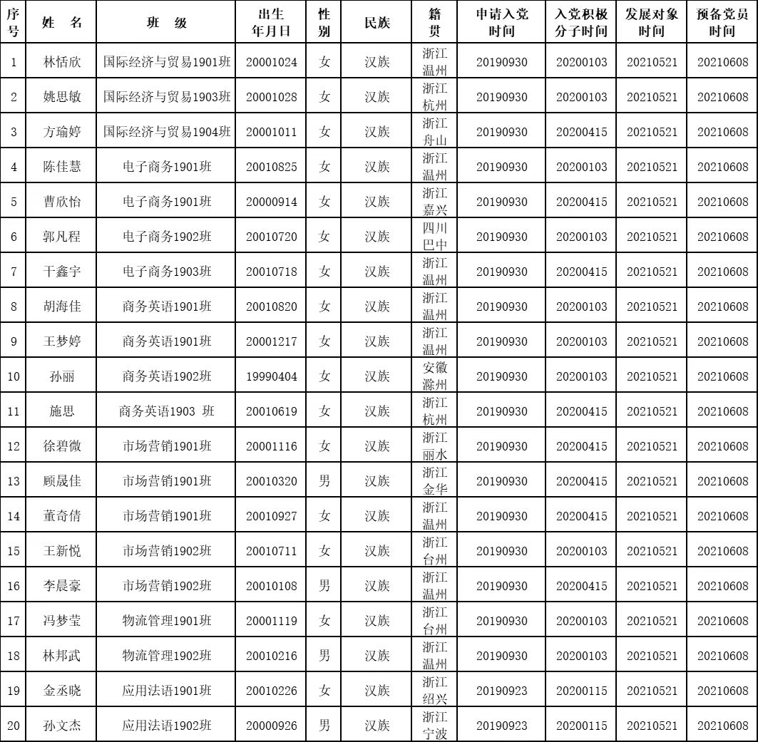 经国际商贸学院学生党支部研究,拟将林恬欣等20位同志转为中共正式党员,现将其基本情况予以公示。在公示期限内,欢迎广大党员、干部、群众通过信函、电话或直接到党支部或上级党委部门反映公示对象在预备期间思想品质、现实表现、廉洁自律等方面的情况。