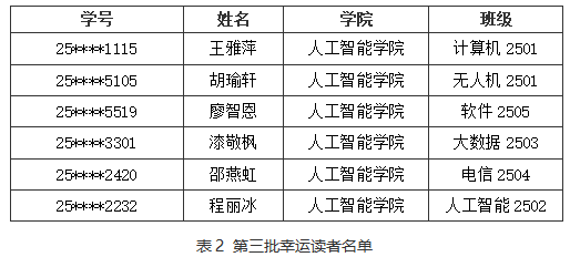 经统计,人工智能学院入馆教育完成率在各分院中最高。为鼓励新生积极参与入馆教育,本次第三批幸运读者从该学院完成学习的新生中随机抽取产生,共6 名,具体名单如下(见表 2)。