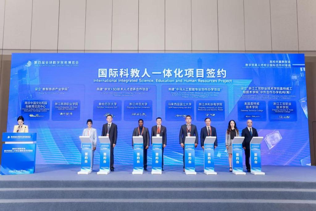9月28日下午,由浙江省人民政府主办,浙江省商务厅、浙江省教育厅、浙江省人力资源和社会保障厅承办的“高校共襄数贸会—数字贸易人才校企国际合作对接会”在杭州大会展中心举办,副校长汪焰、美国盖特威技术学院、北卡教育联盟等一行参加会议。会上,一批高水平国际合作项目落地,成为本次活动的“亮眼成果”,学校作为签约项目之一,由汪焰副校长代表学校与美国盖特威技术学院签署共建“伟德BETVlCTOR1946盖特威工程技术学院(筹)”中外合作办学机构。