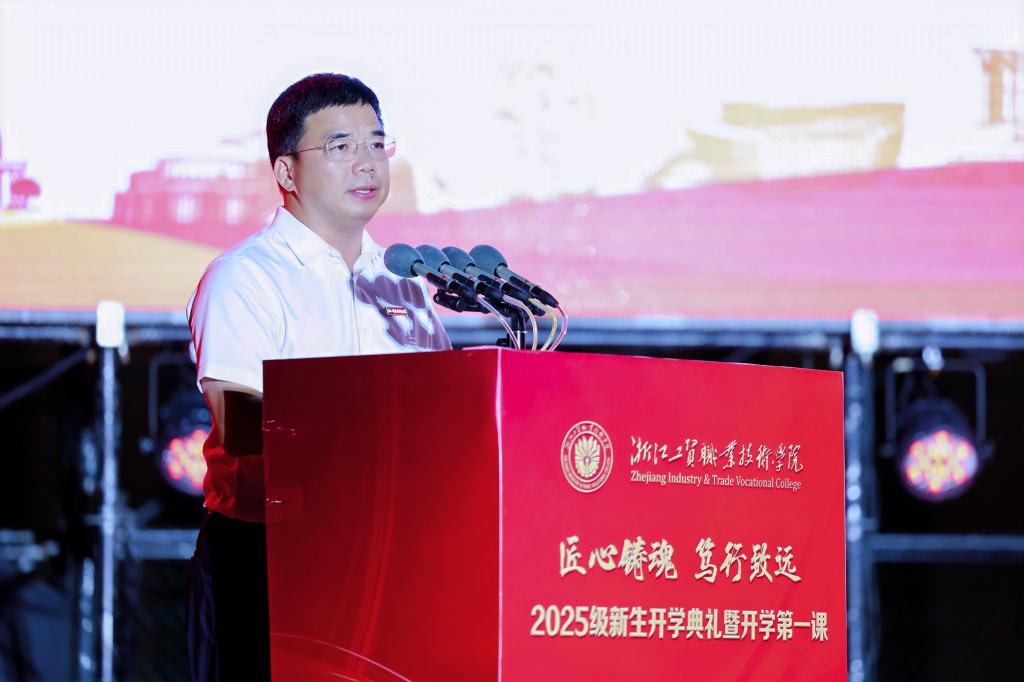 党委书记张志东以《立德树人德技并修青春许国——在新时代新征程上挺膺担当收获新进步谱写新篇章》为题为新生讲授“开学第一课”。他对新生提出四点希望:一是要爱上工贸,朝气蓬勃迈上新征程。学校必定会给同学们最优质的教育教学和成才生态,许大家一个最美好的未来。以创设好专业、好老师、好就业的“三好”条件,提供学校用心,家长安心,学生开心的“三心”服务,以及链接两个校区和社会打通的“三美”环境,呵护每一位同学的成长成才。二是要铸魂青春,挺膺担当奋斗新时代。要坚定理想信念,忠于党、忠于国家、忠于人民、忠于社会主义,把伟大抗战精神深深熔铸于实践中;全面学习贯彻习近平文化思想,增强文化自信,增强“文化的力量”;始终做政治安全的守护者、主流价值的传播者、时代使命的践行者。三是要全面发展,茁壮成长收获新进步。成长是一场不断超越自我的马拉松,进步是日积月累的必然结果。在学校求学的时光里,同学们要筑牢专业之基、拓展素养之翼、促进身心健康、提升综合素养,用全面发展铸就青春最亮丽的底色,努力成长为德智体美劳全面发展的社会主义建设者和接班人。四是要追逐梦想,奋发有为谱写新篇章。追逐梦想,首先要敢于有梦,立下青春志向;更要勇于追梦,付诸扎实行动;还必须勤于圆梦,融入时代洪流。同学们的理想追求,要在推进中国式现代化、大力发展新质生产力的时代的坐标系中实现价值的最大化,矢志技能成才、笃行技能报国。