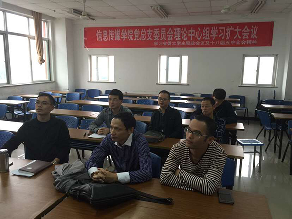 为了学习贯彻《中国共产党廉洁自律准则》、《中国共产党纪律处分条例》、“十八届五中全会精神”和“省委大学生思想政治会议精神及夏宝龙讲话精神”,11月20日下午,信息传媒学院党总支委员会理论中心组扩大学习会在6712教室举行。分院院长、分院党总支书记、分院总支委员、分院各专业主任及辅导员等参加本次学习讨论会。