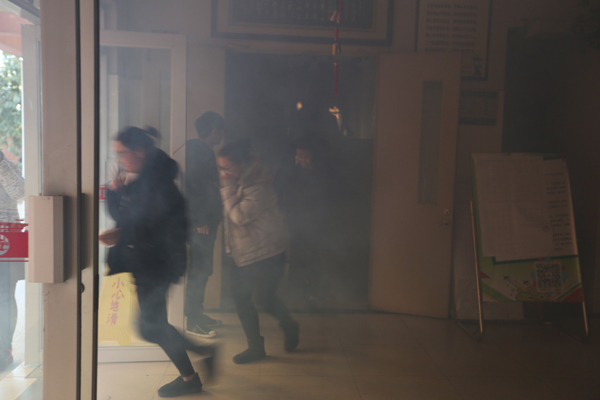 下午演练活动开始,学生公寓E幢204寝室发生了“火情”,学院立即启动应急预案。在领导小组的统一指挥下,义务消防队、疏散组、医疗后勤保障组立即进行救火、疏散、救护等措施,同时拨打校园“110”报警求救。学生们在老师的引导下,用湿毛巾或衣服捂住口鼻,依次猫着腰、沿着消防通道迅速撤离。整个演练过程井然有序,顺利完成。