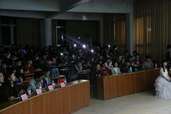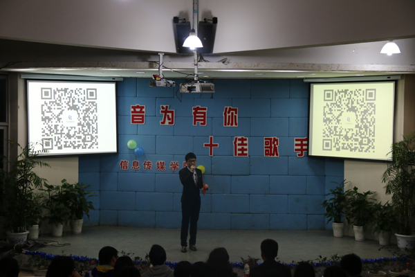比赛开始前,整个现场都闪耀着荧光棒、手机闪光束和压不住的呐喊声,在特邀嘉宾蔡成龙同学的一曲《天后》之后,紧张的比赛正式开始。第一轮共15名选手分两批进行比赛,令人印象深刻的是有一位选手用一元硬币边弹吉他边进行演唱,一曲《故乡》唱得全场如痴如醉。比赛过程中,同学们纷纷拿出手机打开手电筒功能,摇动手机为选手们欢呼加油。为进一步增强选手与观众的现场互动性,分院学生会技术部的同学充分发挥专业特长,在“信息传媒学院团总支”微信平台上开通了“微信墙”活动。同学们通过加入“微信墙”,可以将自己的现场感受和加油鼓劲直接留言“上墙”投影到大屏幕上,“墙上”气氛热闹非凡。