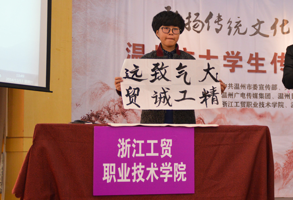 为了进一步弘扬中华传统文化,增进同学们对中华传统文化的认识和了解,提高大学生的传统文化素养,以实际行动践行“中国梦”的理想信念,由中共温州市委宣传部、共青团温州市委、温州市教育局、温州广电传媒集团、温州日报报业集团、温州市学生联合会联合主办,我院和温州市传统文化促进会承办的温州市大学生传统文化知识竞赛于12月13日在我院多功能厅举行。团市委学校部副部长池腾飞、温州市委党校文化与社会学教研部副主任陈中权副教授、温州市社会科学院董约武副教授、温州市瓯越传统文化研究会会长陈玲女士、我院管理学院张勰老师、学院沈智毅教授应邀观看比赛并担任评委,与现场学子一起走进国学、回顾经典、感受中华传统文化的博大精深,活动由温州市电视台知名主持人戴一品主持。