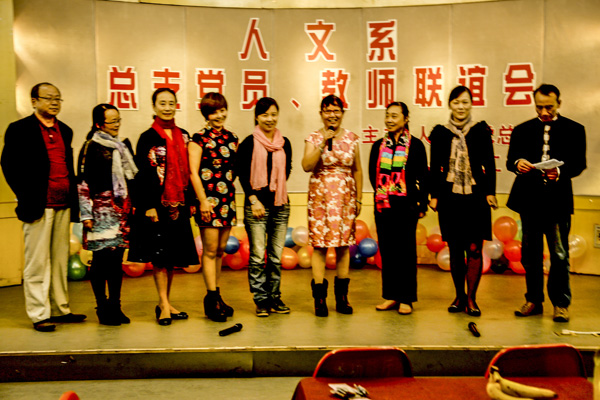 11月14日,人文系党总支在多功能厅举行人文党总支党员、教师联谊会,人文系党总支下属教工、学生、体育发展中心3个支部30余位党员及全体教师、部分学生代表参加活动。人文系5个教研室都排练选送了各自的节目参加。活动寓教于乐、其乐融融,高潮迭起,精彩纷呈:两课思政教研室的党员、老师们表演了自己原创的诗朗诵《我骄傲,我是思政老师》;公共英语教研室的党员、老师表演了自己原创的小品《一堂英语课》; 法语、理科、人文艺术教研室老师分别表演了《我叫伊莲娜》、《油瓶子怕摔》、《我的祖国》等歌曲,学生代表也表演了相声等节目。活动中,还进行了党的知识竞答、集体互动游戏等,受到党员群众的热烈欢迎。