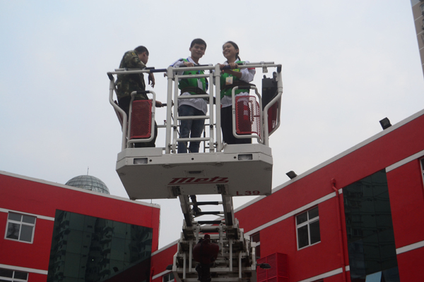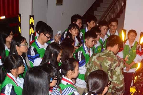 同学们步行至消防基地,受到了消防官兵们热情的接待。首先,消防官兵带领志愿者们参观了温州市消防支队特警二中队的荣誉墙、电子阅览室、生活区的寝室,让同学们“零距离”感受消防官兵们的日常生活。紧接着,消防队员向同学们介绍了消防车的种类以及每种消防车的用途,以及消防车内的器件名称和种类,如救援气垫、伸缩梯、扩张器等等,同时还讲解了消防队在这整个社会生活中所扮演的举足轻重的角色。在消防服展示区,消防员们为同学们展示了消防服的穿法,并让同学们亲身体验。大家十分幸运地感受到云梯的“高耸入云”。
