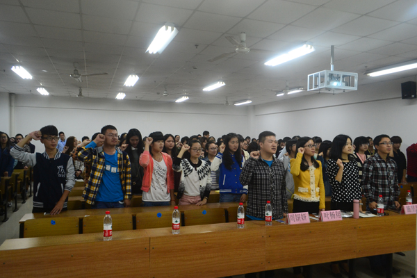 速卖通班班主任叶老师介绍了电商创业的具体流程,并宣布了第二届网络外贸零售大赛的比赛规则。跨境电商创业协会指导老师周老师致祝贺词,并鼓励同学们携手并进,资源共享,勇创奇迹。大会最后,大学生跨境电商创业协会社长吴潇带领全体会员进行宣誓,誓言积极向上,大家情绪高涨。