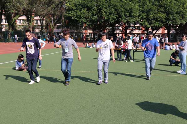 拓展活动由“踩地雷”、“抛绣球”、“九人十足”、“无敌风火轮”、“你比划我来猜”和“运输乒乓球”等项目组成。活动伊始,“踩地雷”处一大批同学各自忙活了起来,一些同学负责指挥,一些同学负责踩气球,“啪啪啪”的气球爆破声四处响起,阳光照耀着大地,同学们的笑声响彻天空;在“抛绣球”项目中,同学俩俩搭档,抛出了一段段优美的弧线;“你比划我来猜”则让同学们真正体会到了什么叫默契。场上最热的项目非“九人十足”莫属,期间不时传出响亮的“一二、一二……”,活动中有些同学跌倒了,周围的同学都捏了一把汗。但跌倒又如何?同学们爬起来照样干!节奏乱了又如何?同学们调整之后照样大步向前!大家在活动中展示了青春魅力,也锻炼了团队合作能力。