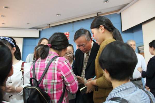 会后,黄先生引来学生“粉丝”请求签名