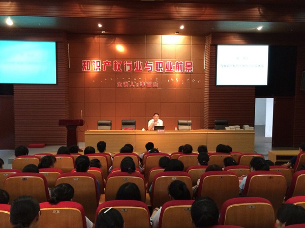 当天下午,陶老师为新同学上了知识产权管理第一课。陶老师言语风趣,深入浅出地向学生讲解知识产权管理导论,博得同学们阵阵掌声。