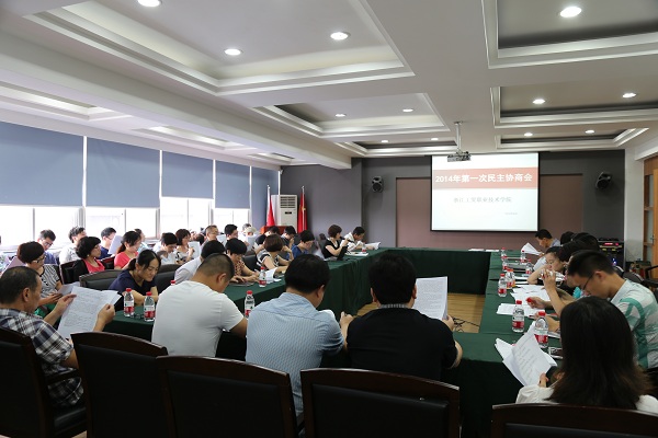 2014年第一次学院民主协商会于6月30日在知识产权园二楼报告厅召开。学院工会委员,教代会正副团长,分工会主席,各院系高、中、初级职称教师代表,图书、工程系列代表,相关行政职能部门负责人等58名代表参加了会议。