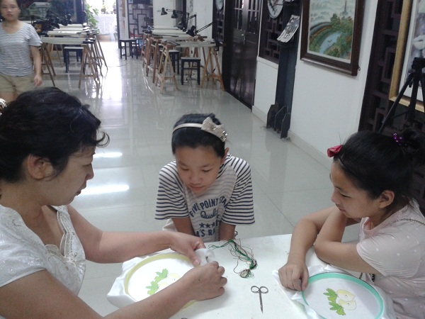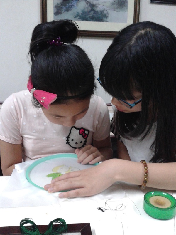 7月4日,经过昨日雨水洗涤,空气显得尤为清新。来自市区的10多位中小学生在家长的陪同下早早地出现在瓯塑文化课堂——位于浙江创意园102室。这里的所展示的创意产品,激发了小朋友们的好奇心,也给他们创造了一个轻松舒适的氛围。在接到属于自己的绣品后,先由瓯绣大师邹绳珠老师给小朋友们介绍基本的绣法,以及如何才能让毫无生机的绣品在他们的针法下变得生动形象、活灵活现。在听完邹老师的介绍后,小朋友们开始专心致志地思考如何创作属于自己的作品。邹老师和实践队员们总是在这些小朋友不懂或是穿针方面巡回指点一二,使得这些小朋友能够尽快入门,全身投入。队员们看着每一位小朋友小心翼翼穿着引线的动作,满意的心也不言而喻。