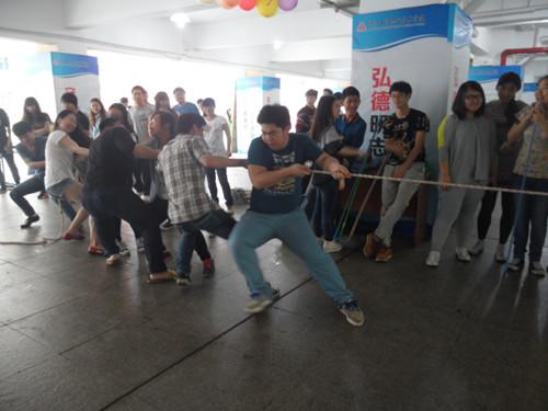 本次大比拼活动种类繁多,团体活动包括拔河取物、无敌风火轮、螃蟹运球、争分夺秒、解手链等活动。个人或双人活动包括蒙眼踢球、双手齐心、霸王斗鸡、背篓接球,捡豆子等活动。一切准备到位,活动正式开始,干事们认真计分,同学们都兴奋地开始了自己的游戏,现场时不时传来阵阵欢声笑语。此时,F2楼下已经围满了人,有拔河的,捡豆子的,解手链的,个个玩的不亦乐乎。游戏获得者可以得到一次抽奖机会,有鼠标垫、记事本、小公仔和寝室四件套(衣叉、畚箕、扫把、拖把)等丰富的奖品。同学们既可以玩游戏又可以得到奖品,活动现场的气氛达到高潮,一直持续到下午。