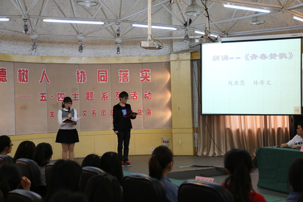 近日,人文系在学院多功能厅举行以“立德树人 协同落实”为主题的“五四”青年节纪念活动。出席活动的有人文系党总支副书记徐辉老师,辅导员叶盛芳、尤裕老师,班主任夏耀老师以及人文系全体学生。