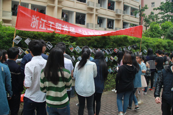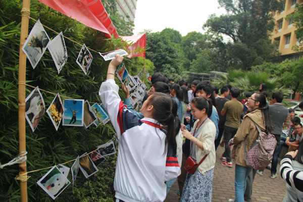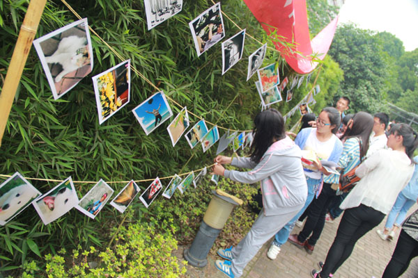 5月4日青年节,阳光明媚中午,信息传媒学院首届摄影大赛复赛在六号楼对面的竹墙边进行展览并进行大众投票。一张张参差不齐的照片夹在竹林当中,别有一番风味。
