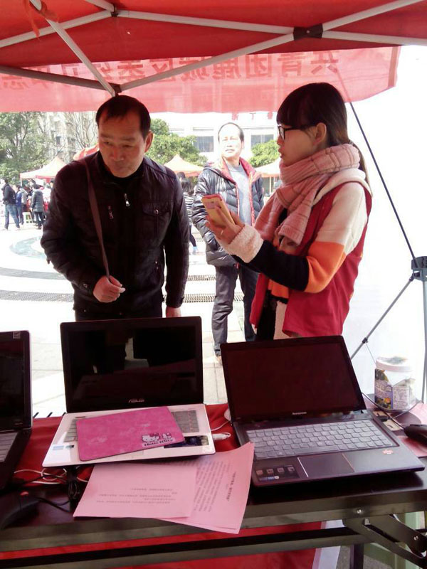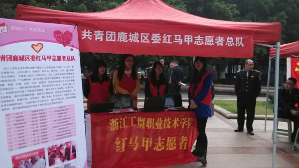即使在校外,你也能看到红马甲志愿者的身影,他们参加了鹿城区志愿者服务团成立仪式暨“雷锋在身边”志愿者服务主题活动,他们热情地将网络购票的方法教给市民,教他们如何使用微信等等,他们用灿烂的笑容、专业的知识感染着周围的每一个人。