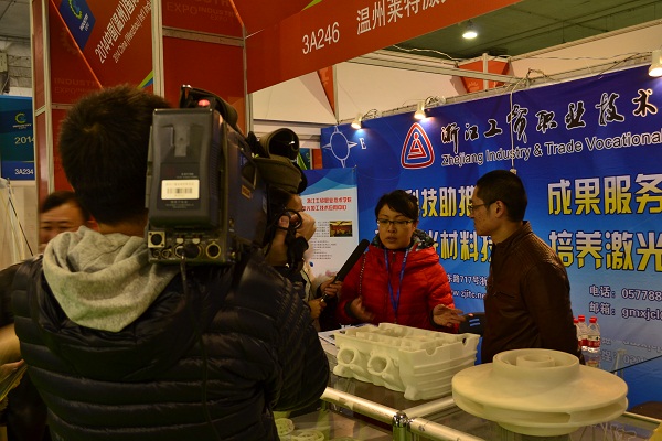 本次展会上,展出了学院姚建铨院士工作站研发的多项3D打印技术,可用于温州汽配、泵阀、电器、激光光电、轻工业等行业。其中一项紫外激光应用技术在2013年浙江网上技术市场交易会上转让给温州德罗斯激光科技有限公司。此次展出的成果包括3D打印制造的模具镶块材料、铝合金多孔泡沫金属、3D打印专用粉末以及3D打印成型砂模、蜡模等成果。院士工作站负责人牛丽媛博士接受媒体采访时,表示:“3D打印技术与传统铸造技术的有机结合是未来3D打印工业应用的发展趋势”。