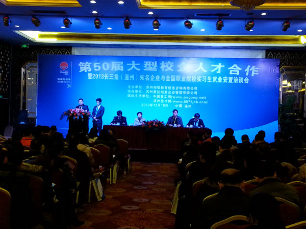 12月18日,“第50届大型校企人才合作暨2013长三角(温州)知名企业与全国职业院校实习生就业安置洽谈会”在温州举行。本次活动吸引了135家来自长三角地区的知名企业,和全国70多所职业院校,到场人数500余人参加校企合作洽谈。我院校企合作办应邀参加了会议。