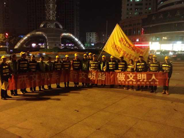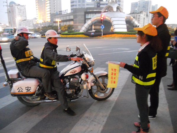 每周三总有一群身着夜光服的交通“小协警”从学院出发,前往物华天宝繁华的交通路口,他们是绿色啄木鸟的志愿者们,为了践行“我的中国梦”,从身边的小事做起,协助温州市交警二大队进行文明交通劝导,杜绝“中国式”过马路行为。汽机学院志愿者队从2013年3月开始与温州交警二大队保持良好的合作关系,截至今日,已经在物华天宝路口服务了近30次。