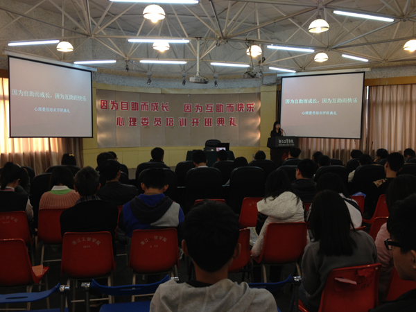 为进一步健全班级心理委员制度,完善校园心理危机预警与监控体系,进一步增强心理委员心理学理论与实践水平,11月20日下午学生处心理咨询室在多功能厅举行2013级班级心理委员培训开班典礼暨首场讲座。学生处处长林海春、心理咨询室邵蕾蕾以及2013级全体班级心理委员和心灵驿站成员参加了本次开班活动。