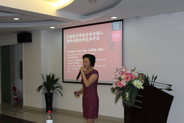 文教授展望了生物材料在医疗上的广泛应用及全球需求状况,介绍了澳大利亚斯威本科技大学的研究方向和近几年的取得的科研成果,及她的团队近十年来在钛合金生物材料方面的研发工作。最后,文教授和大家进行了互动与交流。