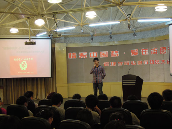大会在《中国青年志愿者之歌》中拉开了序幕。本次大会有四项议程,首先由大二同学张爱玲和蒋浩分享自己的弘恩行经历,紧接着由刚刚加入弘恩行的新生龚慧婷和张钦峰介绍自己以前经历的一些志愿者活动。他们质朴话语激起了即将成为志愿者的大一新生们的热情。第三个环节最激励人心,弘恩行成员对着会旗宣誓,他们的声音铿锵有力,体现了每个人心中强烈的为人民服务的热心。最后管理学院党总支副书记张勰分享了志愿者活动的意义以及如何成为一名真正的志愿者。
