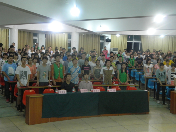10月10日晚,经贸学院“绿丝带”青年志愿者宣誓活动在阶梯教室顺利举行。经贸学院党总支书记项光春,辅导员白福川老师及300余名大一志愿者参加了此次活动。