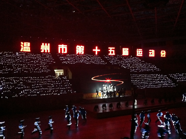 本次运动会开幕式主题是“体育的盛会 人民的节日”,开幕式表演共有四部分组成,我院1800名学生参与此次开幕式演出,参与人数占开幕式全体演职人员的三分之二,也是唯一一所承担演出任务的在温高校。1800名师生承担了千人看台互动、花队旗队、一至九套广播体操表演、生命律动、瓯龙腾飞五组演出任务。千人互动用变换的造型、流动的人浪、激昂的呐喊声贯穿整场开幕式,营造了缤纷绚烂、流光溢彩、千变万化的视觉效果和振奋人心的体育精神。整齐划一的广播操、飞转欢腾的舞龙表演、灵动健美的舞姿打造了一个个开幕式高潮。