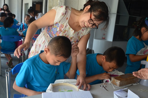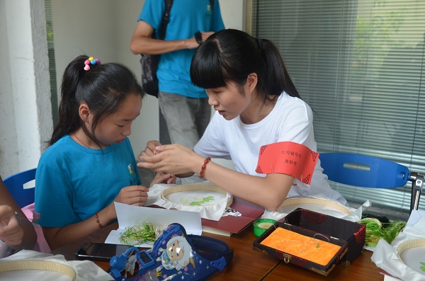 对瓯绣这门艺术产生浓厚兴趣的营员们在学院瓯绣工作室邹绳珠的亲自指导下,学生志愿者的辅助下,纷纷学习起了瓯绣制作。他们仔细观看、细心听讲,一针一线都模仿的有模有样。