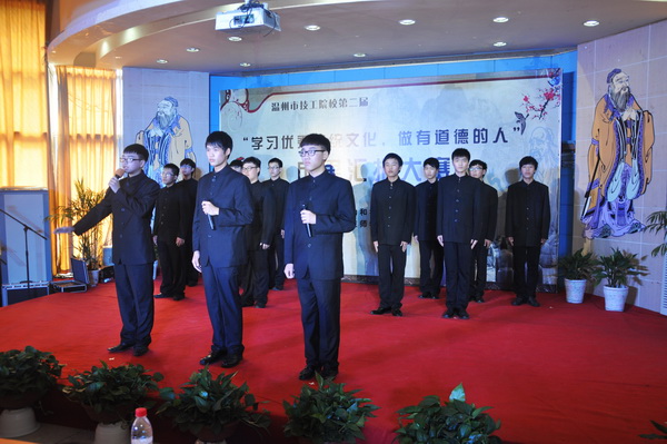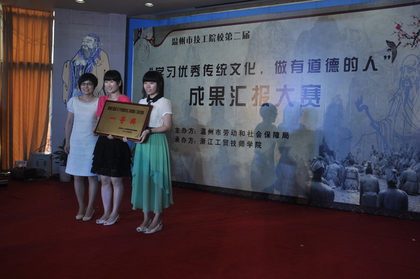 传承中华经典、弘扬传统文化。5月31日下午,温州市第二届技工院校“学习优秀传统文化,做有道德的人”成果汇报大赛在我院举行。此次比赛由温州市劳动和社会保障局主办,我院技师学院承办,温州技师学院、平阳技工学校、瑞安技工学校等8所公办技工院校参加了比赛。