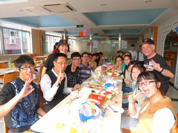 交流会现场,美丽的气球,漂亮的彩带,有趣的张贴画,美妙的音乐,在配上这满满一长桌的美食,充满了派对的气息。交流会上,大家一边享受美食,一边用英语交谈着各种话题。学生尝试着积极发言,老师指导、纠正、鼓励着学生的交谈,师生就像是朋友,一起分享自己身边发生的趣事,处处洋溢着欢笑笑语。别样的课堂,别样的聚会,但是带来的是同样的欢乐。