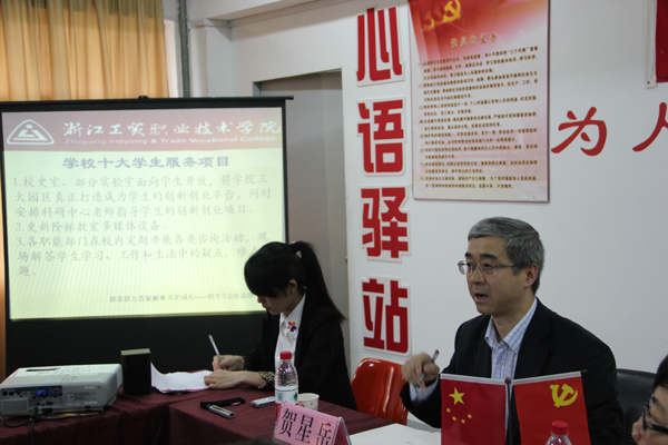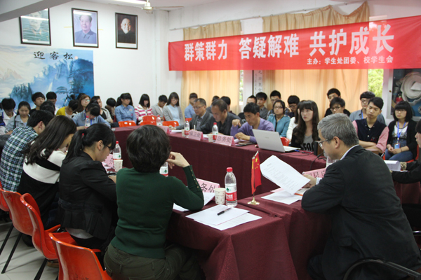 校园是大学生的第二家园,学院的每一位师生都是学校的主人。为给广大师生营造一个健康、有序、向上的校园生活环境,4月17日下午在学生党员之家举办以“群策群力 答疑解难 共护成长”为主题的学院第六期“心语驿站”活动。此次活动由学院党委副书记、院长贺星岳教授和校学生会权益服务部张雨雨同学共同主持,党务工作部、院办、教务处、学生处、总务处、财务处、保卫处、图书信息中心、团委等学院职能部门老师到场解答同学们的问题。