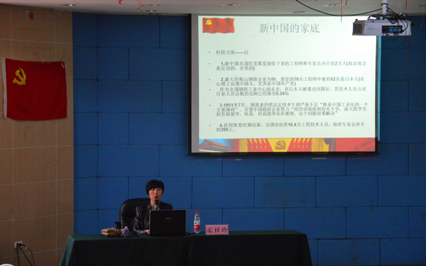 我院人文系思政教研室主任孟祥玲副教授在《坚定不移沿着中国特色社会主义道路前进》讲座上以历届党代会主要流程为主干,并回顾中国一路走来的辉煌路程。她结合十八大新党章,指出要高举毛泽东思想和三个代表重要讲话,坚持科学发展观。
