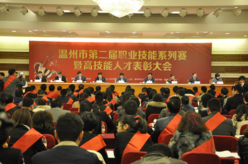 2013年3月2日“温州市第二届职业技能系列赛暨高技能人才表彰大会”在市人民大会堂隆重举行,会议表彰了本次大赛的获奖选手,并对我市公共实训基地和市技能大师工作室进行授牌。大会由温州市政府秘书长叶世强主持,温州市委组织部副部长、市人力资源和社会保障局局长陈进达宣读了各项获奖文件,温州市政府仇杨均副市长做重要讲话。