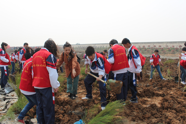 930分,由市领导主持的共青林接碑仪式后,活动正式开始。同学们带着铁锹、铲子和树苗,一步步走向九区植树林。片区到处都是软土,没有站的地方,同学们就将石头铺在地上。土层中夹杂着硬石,无法挖坑,大家就齐心协力搬走石块。活动中,师生们一起动手,大家用手中的锄头和铲子挖了一个个树坑,种上一棵棵希望之树。不一会儿功夫,空地上就栽满了树苗。虽然身体累了,衣服脏了,大家仍继续埋头苦干。