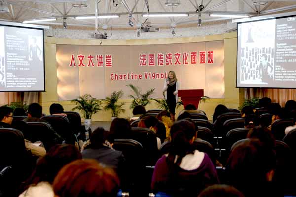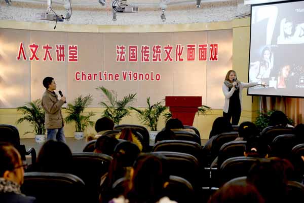 Charline老师在讲座中用流利的法语讲述,人文系法语教研组组长朱浩然老师为同学们翻译其中难懂的句子。在场同学为法国传统文化所赞叹的同时,也被优美婉转的法语发音深深吸引,讲座受到了大家的欢迎。