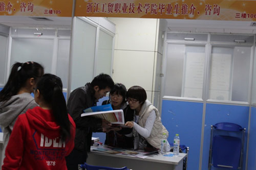 11月25日,学生处就业指导中心、职业规划协会成员到温州人才市场参加2012年温州高校毕业生招聘会,推介我院毕业生、收集并整理用人单位的招聘信息,给毕业生提供寻职咨询。