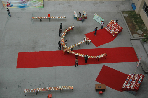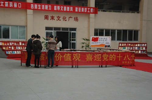 伴随十八大的脚步,沐浴十八大的清辉,追随十八大的神韵,共同打造美好的工贸校园,11月7日,由学院图书馆、院学生党总支主办,院宿管会协办的“践行核心价值观喜迎党的十八大”之书展活动在学子广场顺利举行。这是一场独具特色的书展活动。11张桌子构成的党徽,鲜红的地毯无疑是一道美丽的风景线,吸引了广大工贸学子的眼球。一系列的红色经典、伟人传记以及相关的中国共产党的优秀文集推荐让广大师生读者多读书、读好书、好读书,让读者愿意看,也看得进去。学生情不自禁地纷纷前来品读文集,遨游于知识的海洋。瞧!那驻足于借书处现场借书的热情高涨的同学;那围在咨询处询问入党流程的莘莘学子……11月的书香之气飘散在工贸的每一个角落,让工贸学子时刻沐浴在浓浓的校园文化之中。